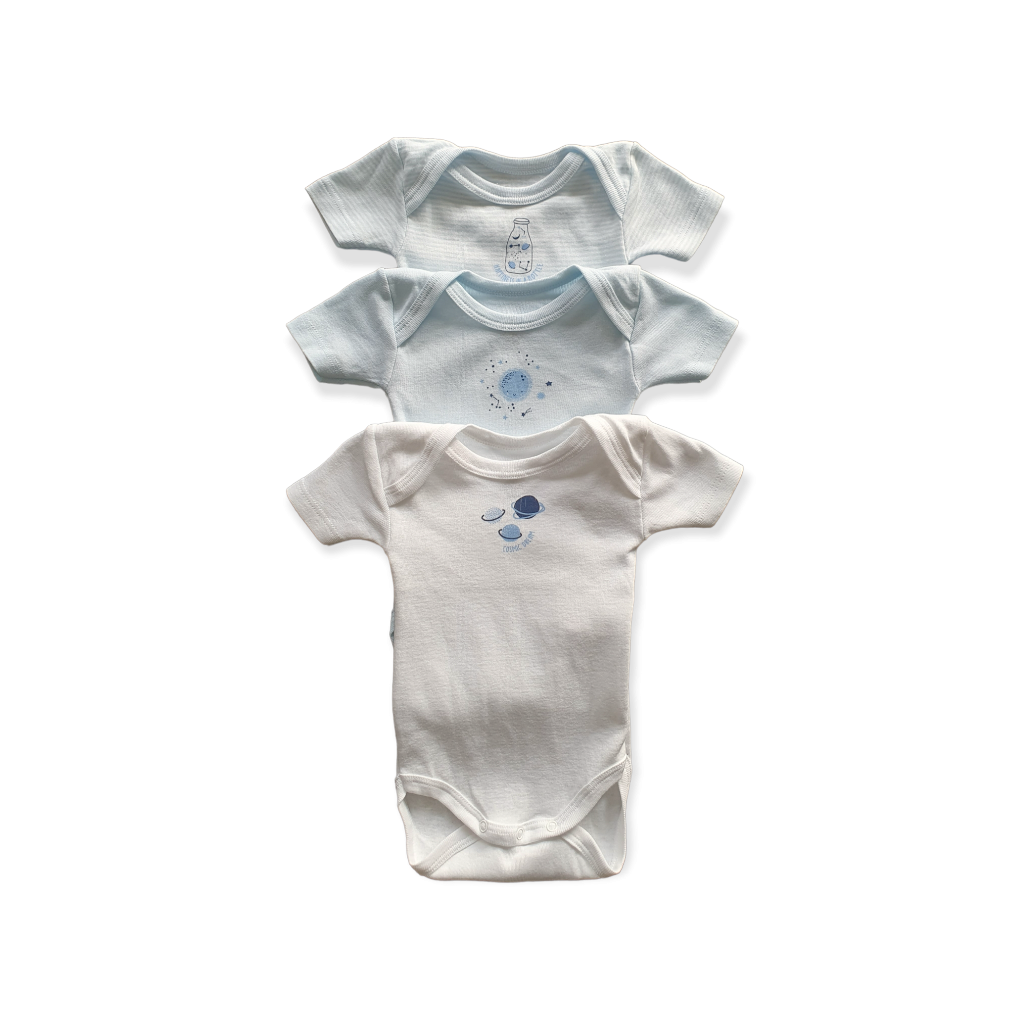 Un joli ensemble de 3 bodys « planètes » confortables de la marque Z. Très pratique, l’emmanchure américaine facilite le passage de la tête.