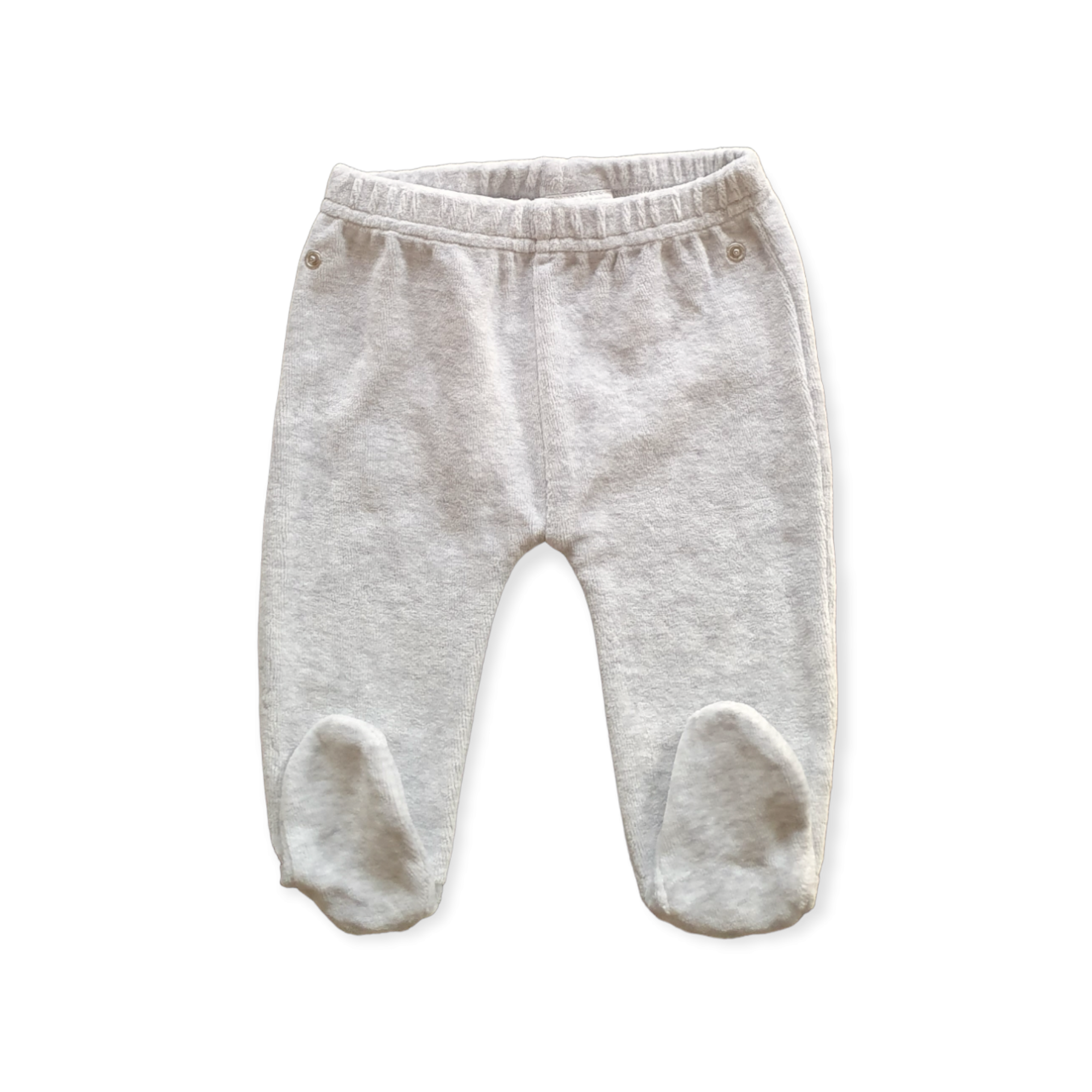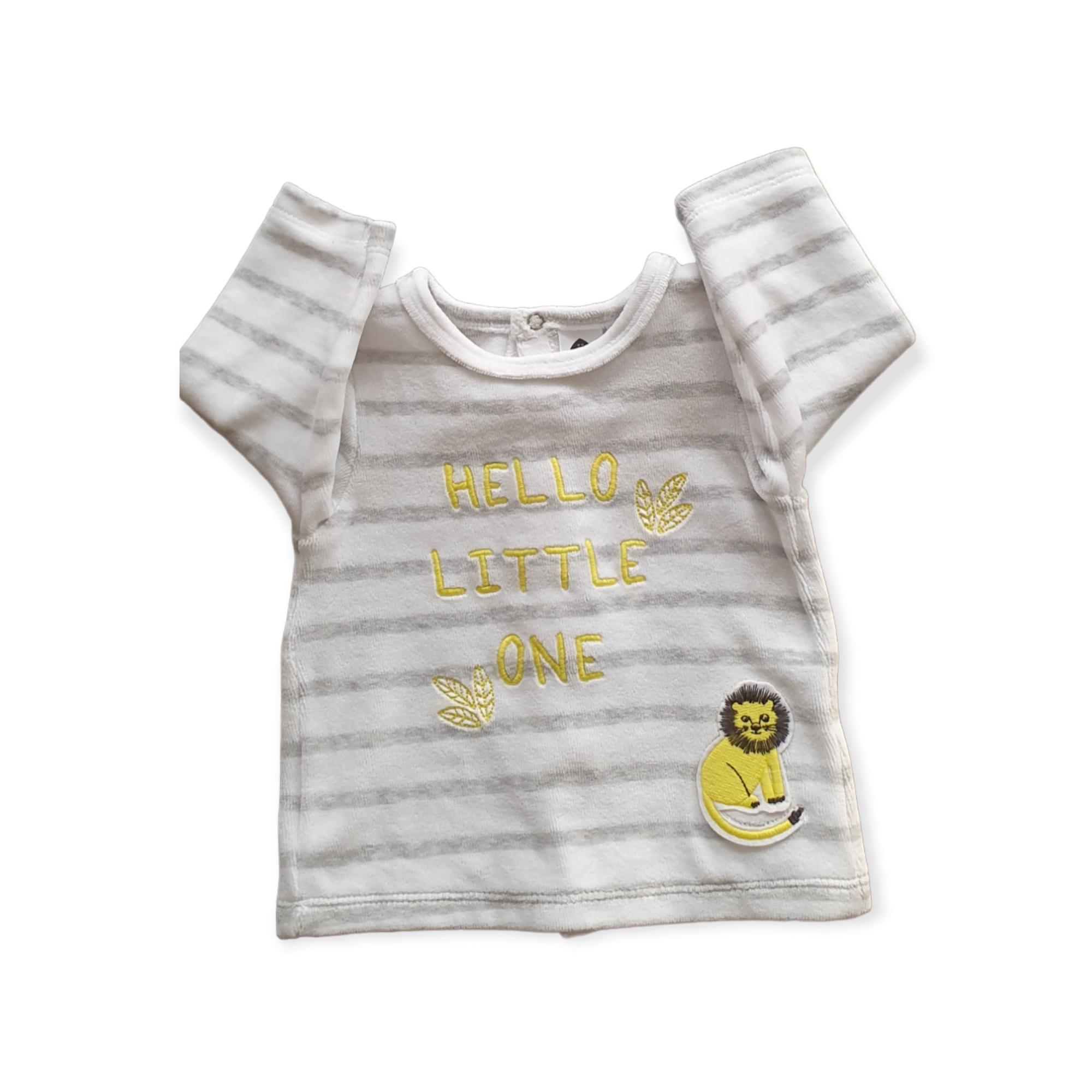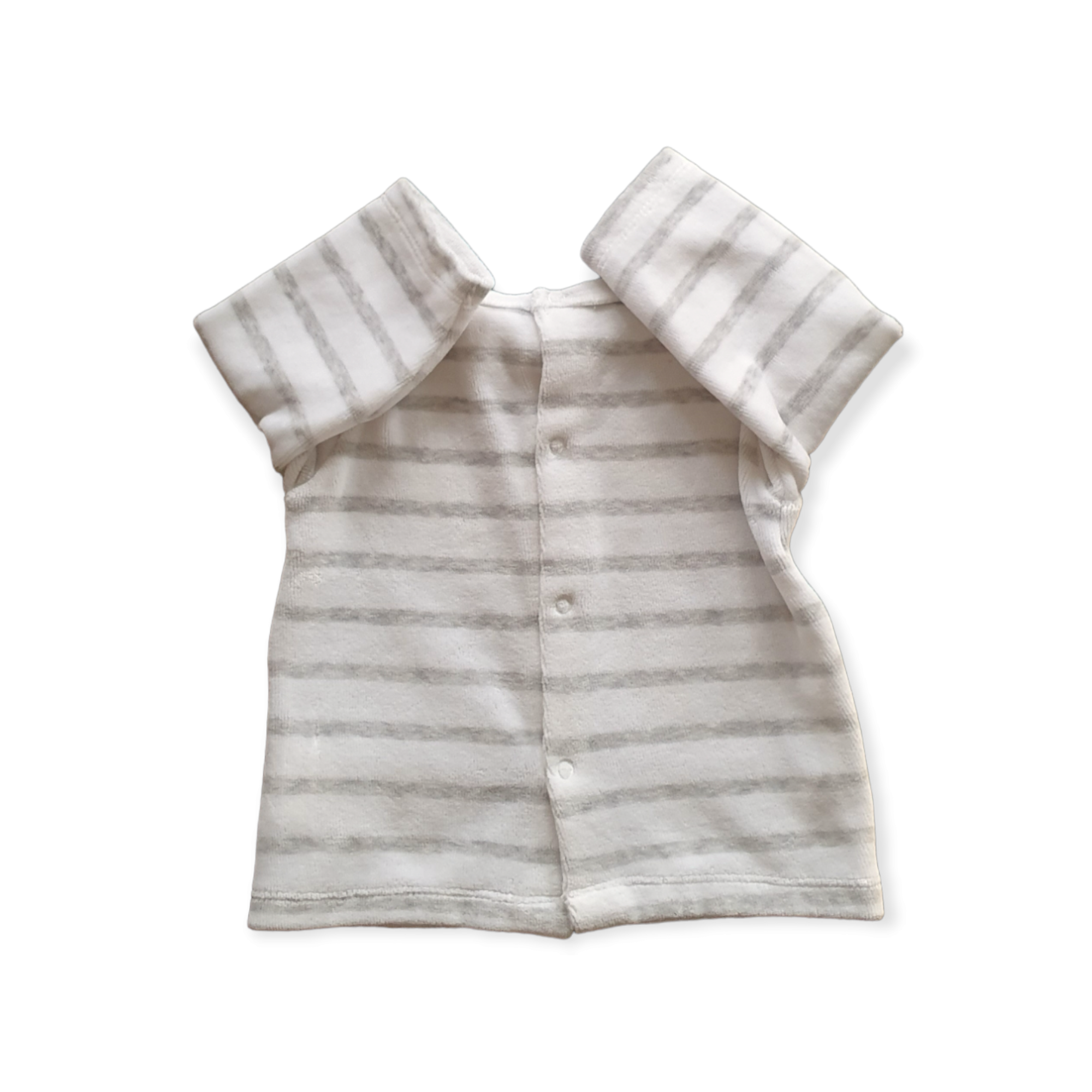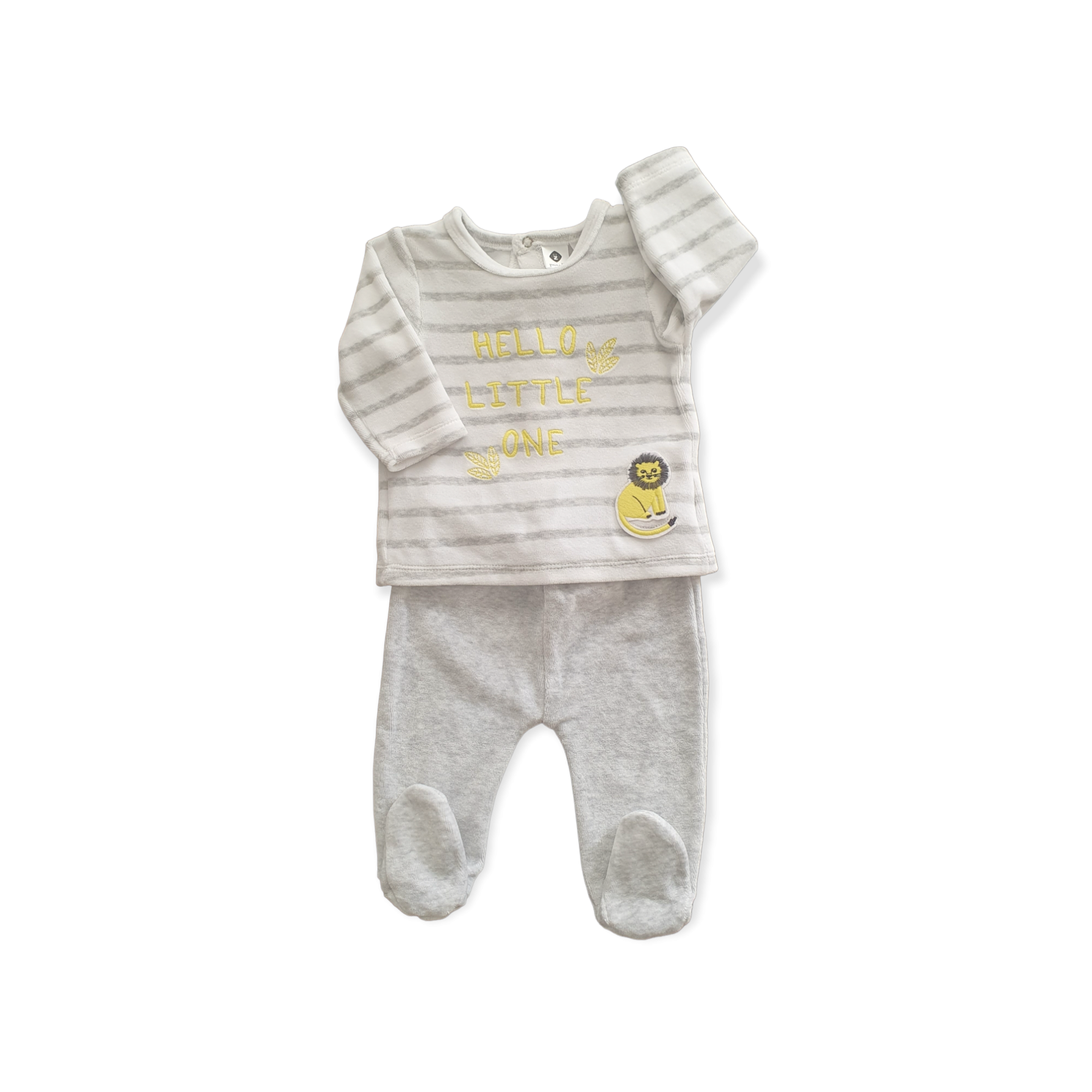 Ce joli petit ensemble en velours est composé d’un haut à manche longue à rayures de couleurs grises avec une fermeture à boutons pressions à l’arrière pour habiller facilement bébé et d’un pantalon à pieds gris. C’est un super cadeau de naissance !